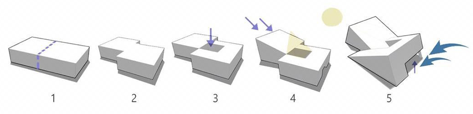The building mass evolved from a basic mass achieving the required volume. Passive strategies implementation as well as microclimate conditions directed its development: the mass was split into two parts along the North/South axis. The parts were shifted from each other along the main axis to increase the shaded surfaces. An open space was carved into the middle of the mass, improving cross natural ventilation of the internal spaces, and offering a private, climate moderated outdoor area.