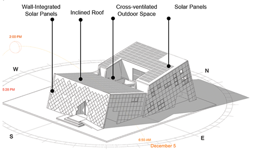 The design relies on adopting passive design strategies to create an architectural mass that reduces the overall energy consumption to the minimum level. Meanwhile the developed building solutions are tailored to the site specifics, constraints and its microclimate. A responsive approach to the site microclimate divided the building mass along the North/South axis giving rise to an elevated structure in the north-East creating an enclosure of a courtyard in the middle of the mass composition to increase its thermal performance. The roofs were tilted in opposite directions to capture the prevailing wind on one hand, while increasing the roof surface area to allocate the additional solar panels on the other hand. Solar Envelope and fenestration were adapted to respond to the surface orientation. The main challenge considers the potentials related to minimizing solar penetration into the building while enabling extended daylight illumination in most of the interior spaces in addition to maximizing natural ventilation.
